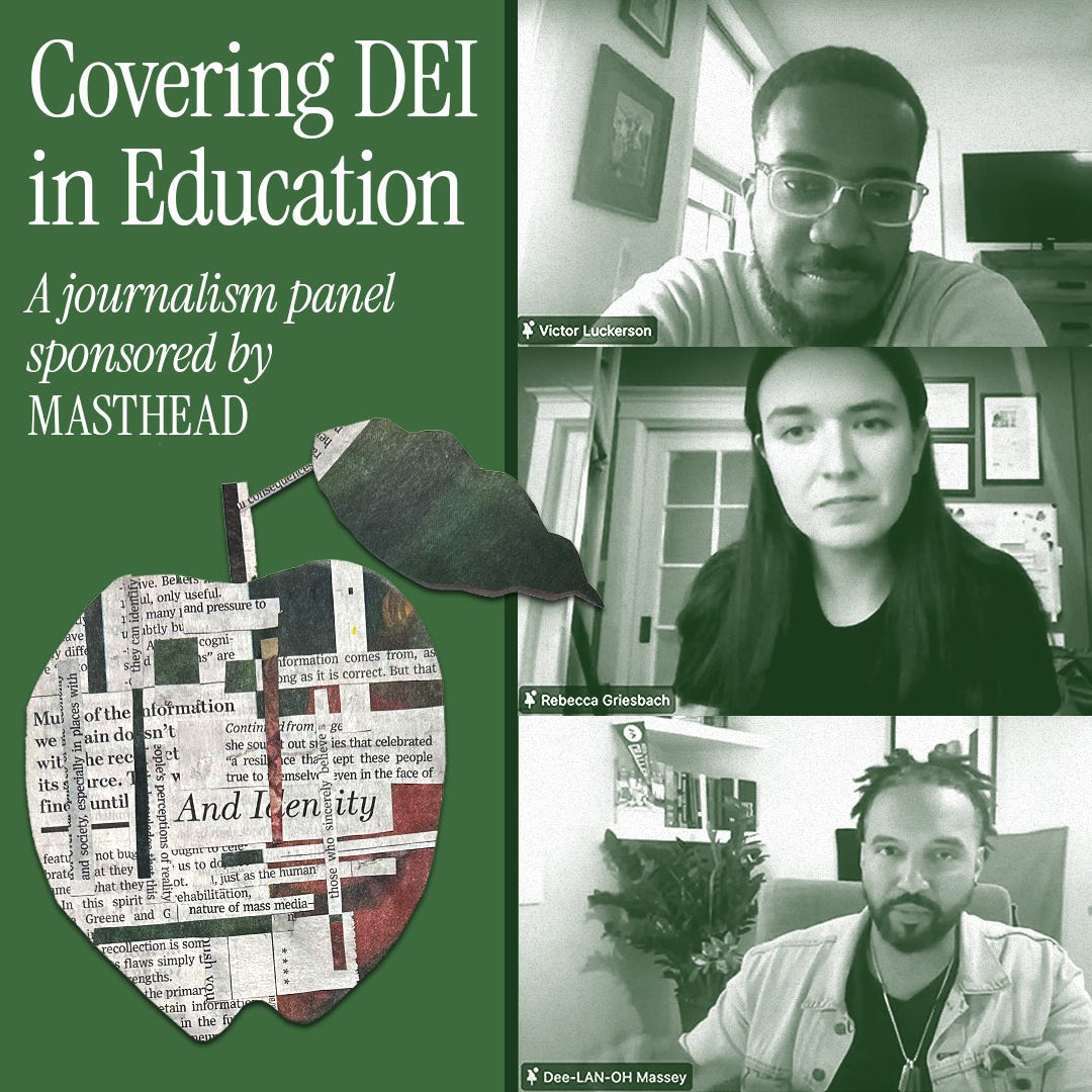 To help student journalists understand how to best tackle these issues, MASTHEAD organized a panel of professional journalists on April 7 who are covering education and diversity at both the state and national level. Rebecca Griesbach (AL.com) and Delano Massey (Axios) spoke with student journalists about how the new laws are impacting the lives of students and educators. They also outlined resources students can use to follow legal challenges to the laws, such as PACER and The Chronicle of Higher Education. Griesbach and Massey offered advice on how to approach interview subjects thoughtfully when discussing issues regarding race, and how to be fair to all sides of an issue while also pointing out lies or misinformation from people in power. MASTHEAD President Victor Luckerson (Smithsonian Magazine) moderated the event.